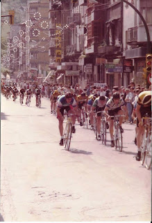 Una carrera al paso por Mieres donde voy colocado en los puestos delanteros con el peloton muy estirado..........en el año 85 podria ser?